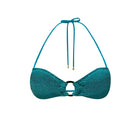 New thick, luxe St. Tropez fabric has a crinkle look with metallic gold fibers running through it, for that ultra high end feel and look. Our Drea Ring Center top ties behind the neck with sliding sides for adjustability. Full lined with opening for your own padding. Add padding for $5.